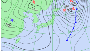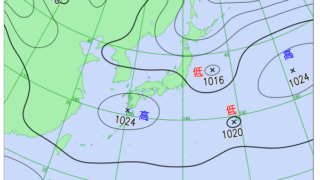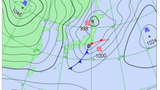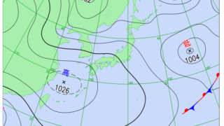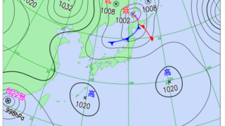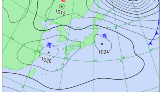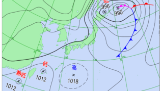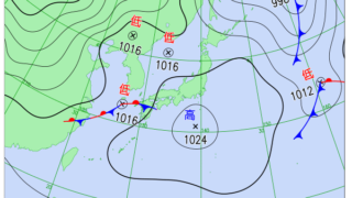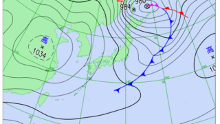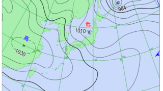 今夜の衛星赤外画像では、気圧の谷に対応する雲域が隠岐の北に観測されています。