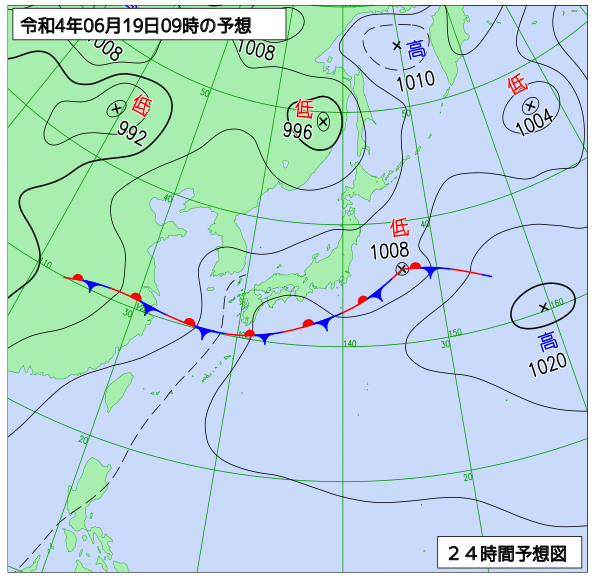 明後日は、梅雨前線が九州から四国まで北上してくるため、はじめは晴れますが、昼過ぎからは雲が広がり、雨の降る所がある見込みです。