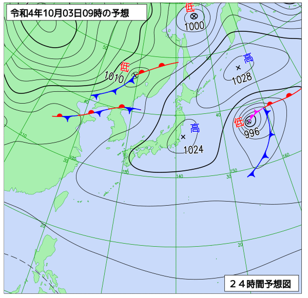 明後日は、暖かく湿った空気の影響で概ね曇り、夜には寒冷前線が南下してくるため、雨が降る見込みです。寒冷前線通過後は、気温が10℃くらい下がるでしょう。