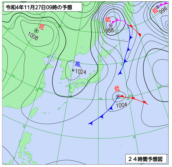 明後日は、東日本に中心を持つ高気圧に覆われるため。概ね晴れる見込みです。