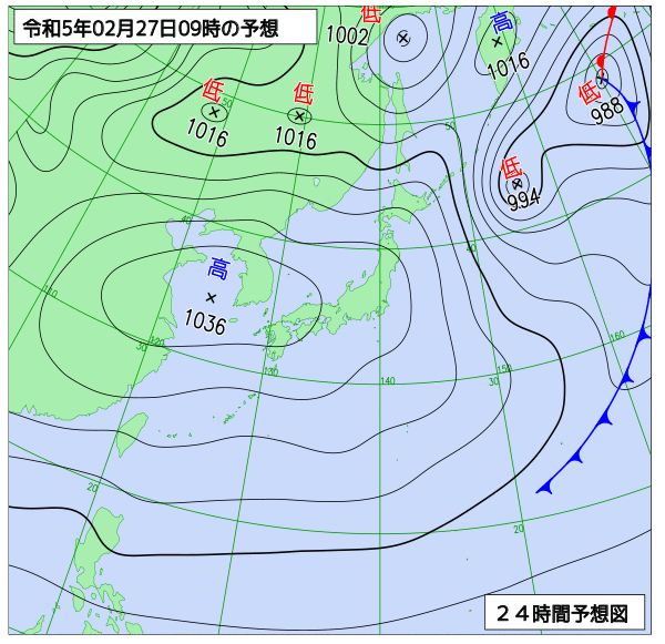 明後日は、日本の東に中心を持つ高気圧に覆われるため、晴れる見込みです。また春の空気に覆われるため、気温は上昇し暖かくなります。