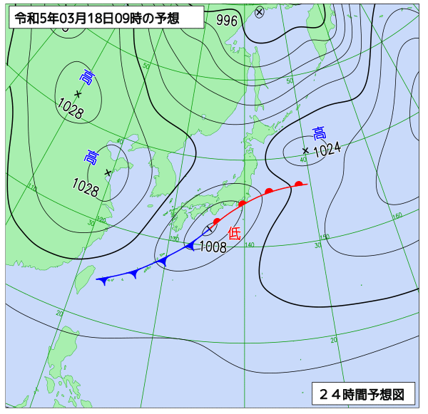 明日は、低気圧が四国沖を通過するため、雨が朝まで降り、昼過ぎからは高気圧の圏内で、晴れてくるでしょう。