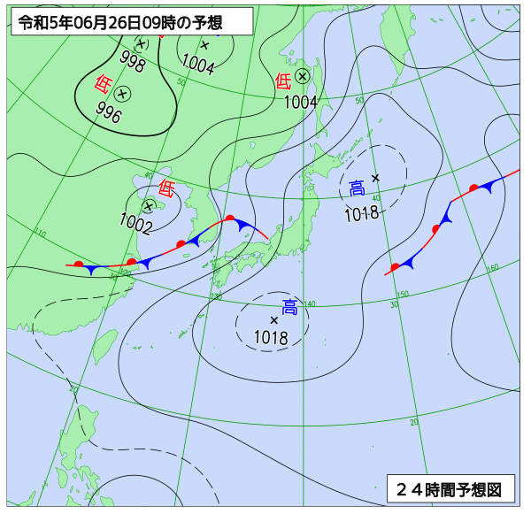 明日は、梅雨前線が日本海まで北上してくるため、雨が明け方から昼過ぎにかけて降るでしょう。