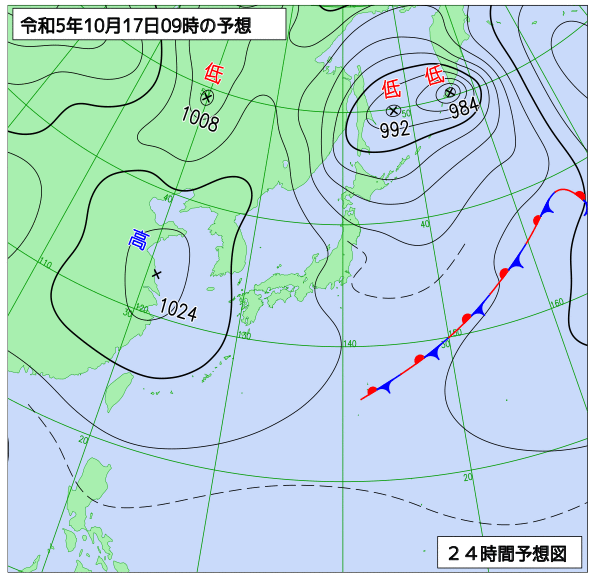 明日は、気圧の谷の影響で、朝まで曇り、雨の降る所がありますが、その後は、高気圧に覆われて晴れてくるでしょう。
