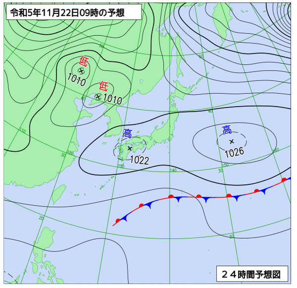 明日は、西日本に中心を持つ、高気圧に覆われて、晴れるでしょう。
