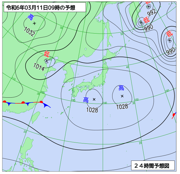 明日は、高気圧に覆われて晴れますが、気圧の谷の影響で夕方からは曇り、夜は雨が降るでしょう。