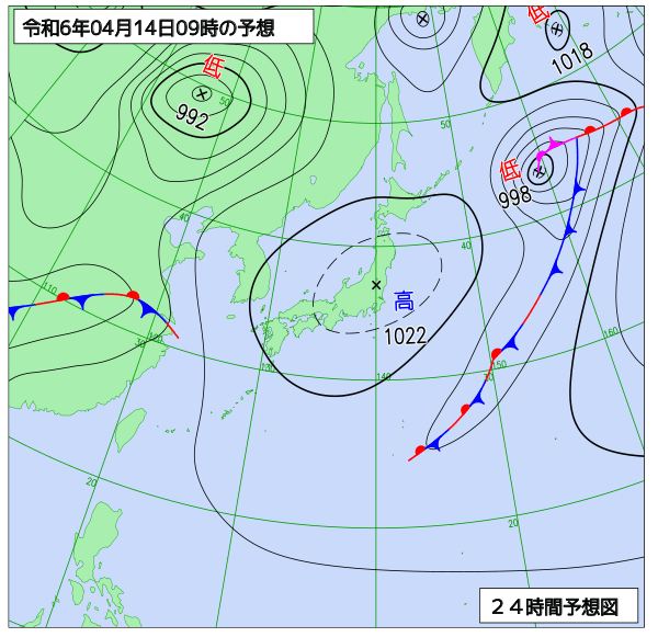 明日は、東日本に中心を持つ高気圧に覆われて、晴れるでしょう。