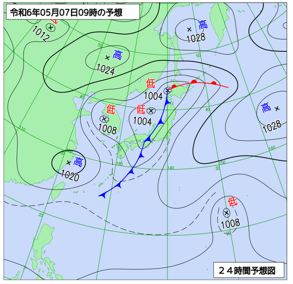 明日は、前線の通過で雨が明け方まで降り、気圧の谷の影響で、夜は雨が降るでしょう。