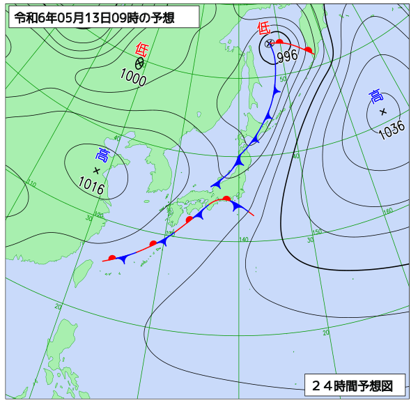 明日は、前線の通過で明け方まで雨が降りますが、その後は高気圧に覆われて、晴れてくるでしょう。