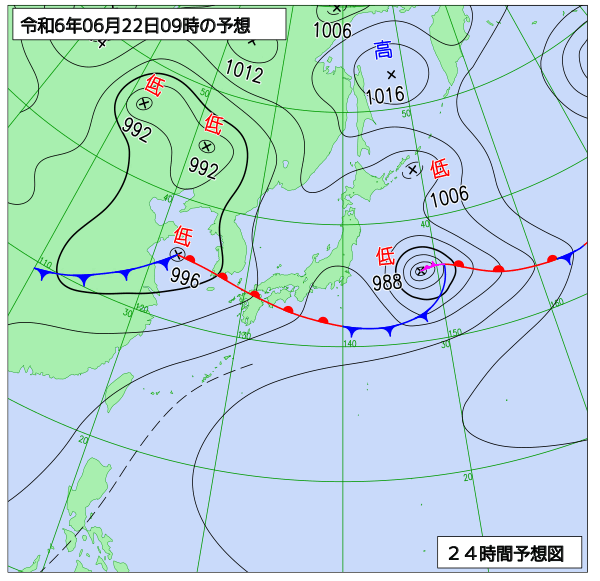 明日は、前線が北上してくるため、曇り、雨が昼過ぎから降るでしょう、