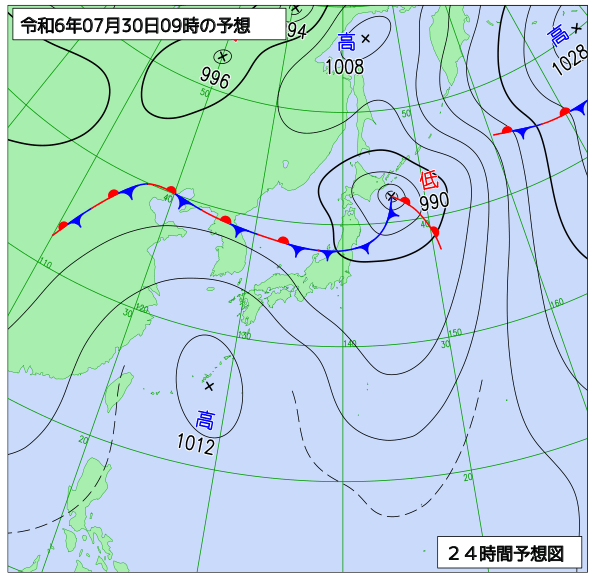 明後日は、湿った空気の影響で、曇り、雨の降る所がある見込みです。