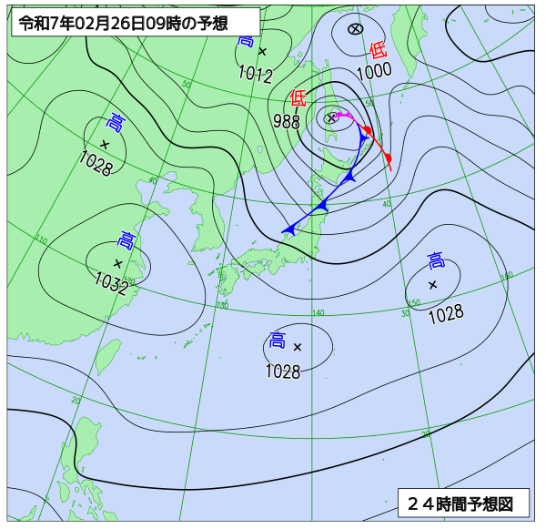 明日は、気圧の谷の影響で曇り、昼頃からは高気圧に覆われて、晴れてくるでしょう。