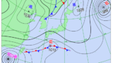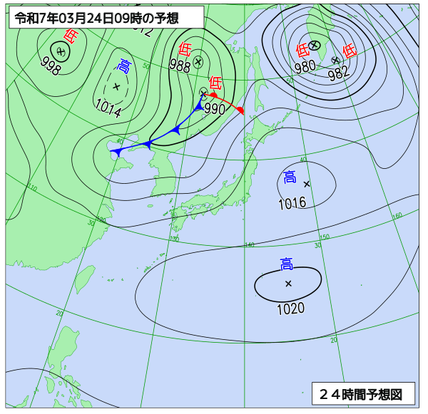 明日は、気圧の谷の影響で、曇り、昼過ぎは雨が降るでしょう。