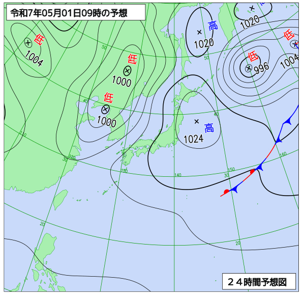 明日は、高気圧の圏内で晴れて、気温が上がりますが、気圧の谷の影響で夜遅くは雨が降るでしょう。